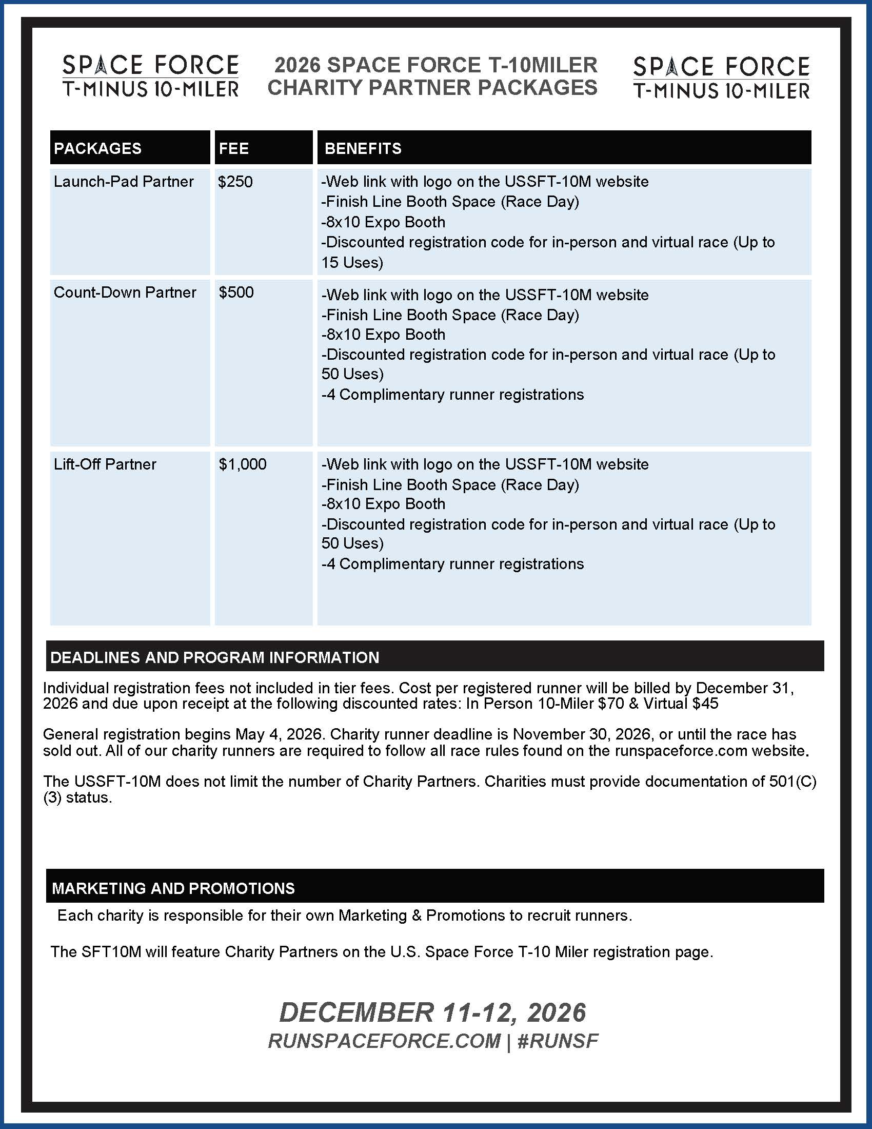Race registration opens May 4th and continues for charity participants up until events sell out or November 30th. Each charity is responsible for their own marketing and promotions to recruit charity participants. The Space Force T-Minus 10-Miler will promote Charity Partners as outlined in the individual agreements. After event sell-outs, all Charity Partners will be promoted via social media, website, e-blasts, etc. The Space Force T-Minus 10-Miler does not limit the number of Charity Partners and charities must provide documentation of 501(c)(3) status.